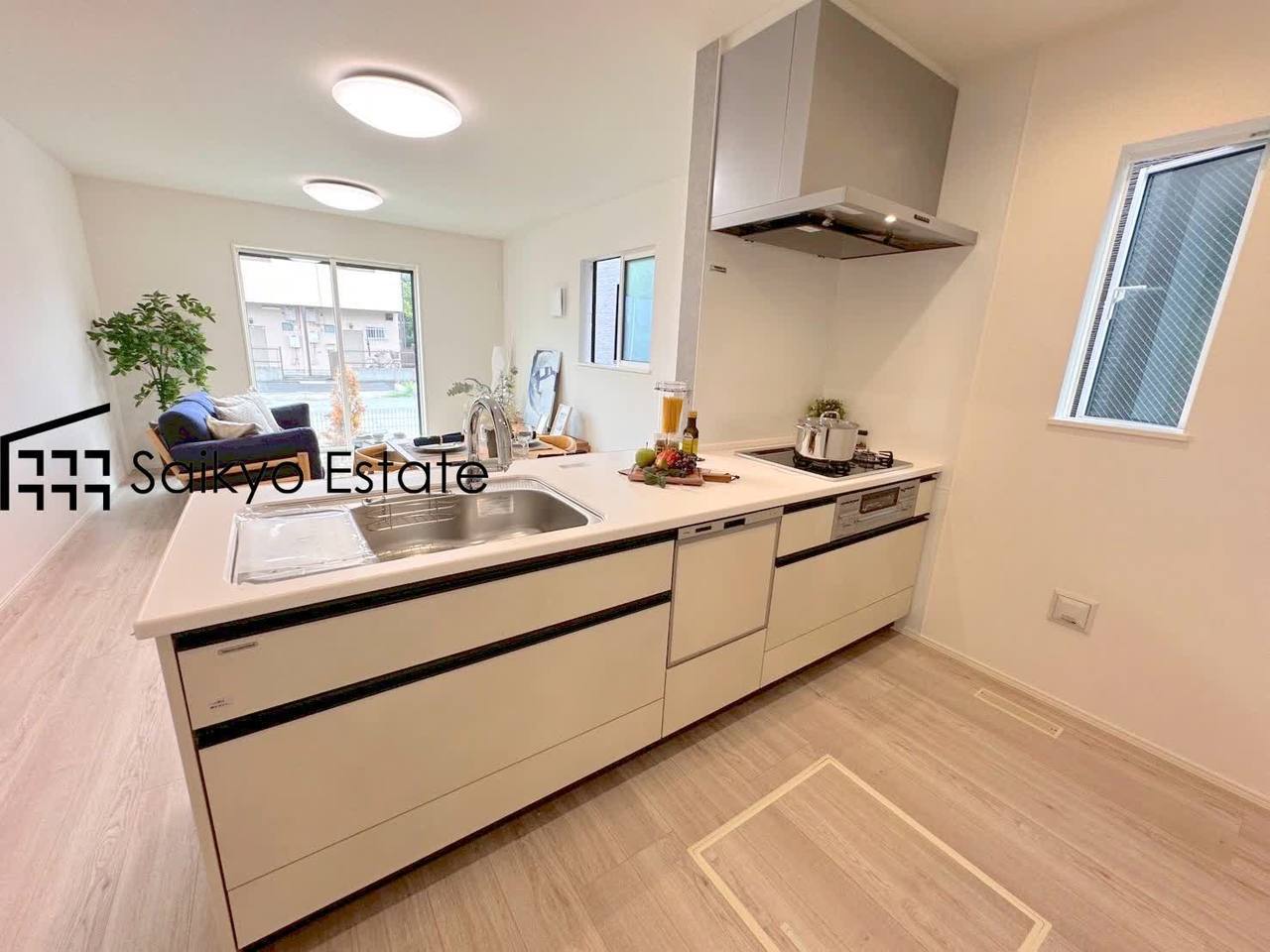 【施工例】リビングにいる家族とコミュニケーションをとりながら作業が出来る人気のカウンターキッチン。お子様がリビングにいても目が届くので安心です。