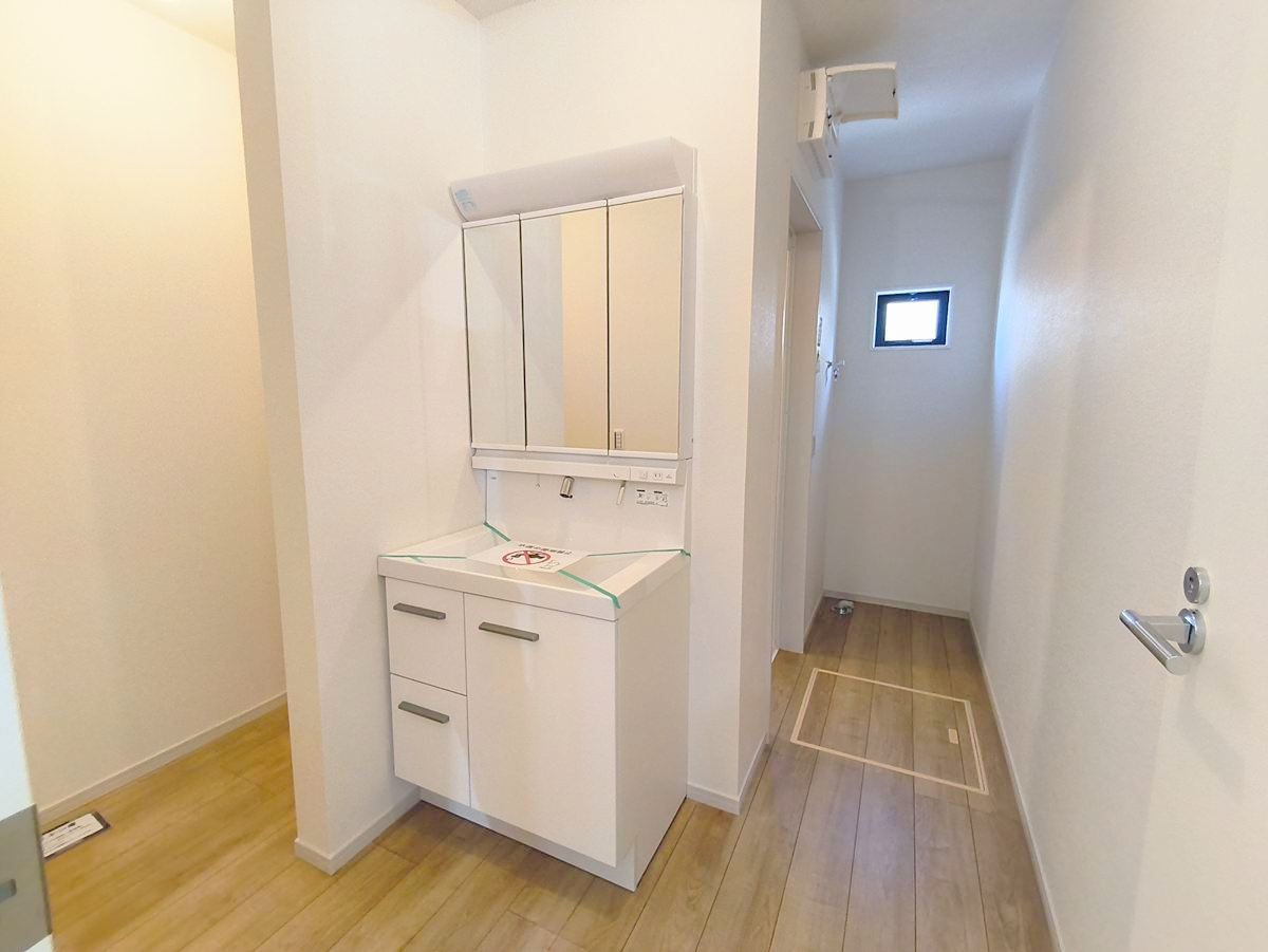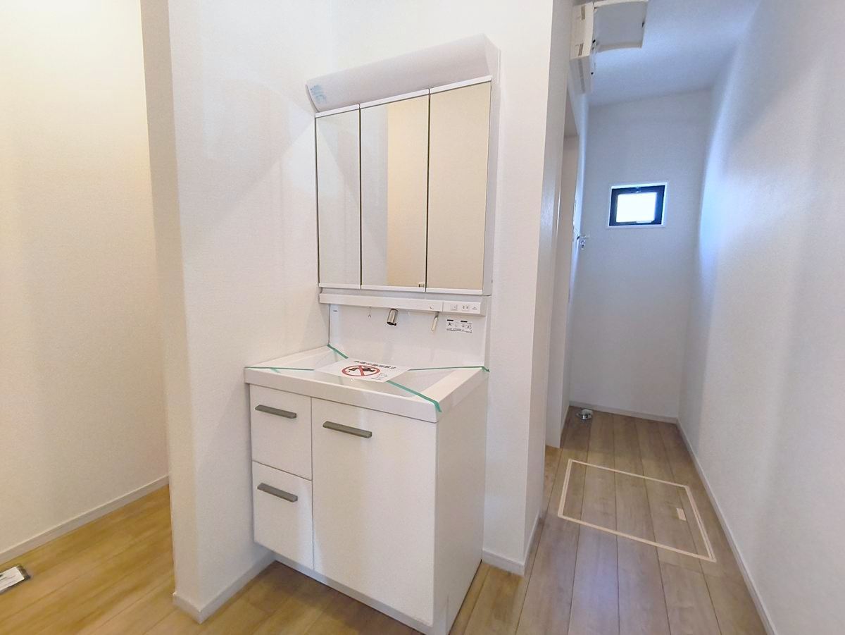 大きな三面鏡がついた洗面化粧台。鏡の裏にも収納があり洗面台がすっきりと片付きます。朝の身支度にも大変便利です。 ■八王子市元横山町3 新築一戸建て■