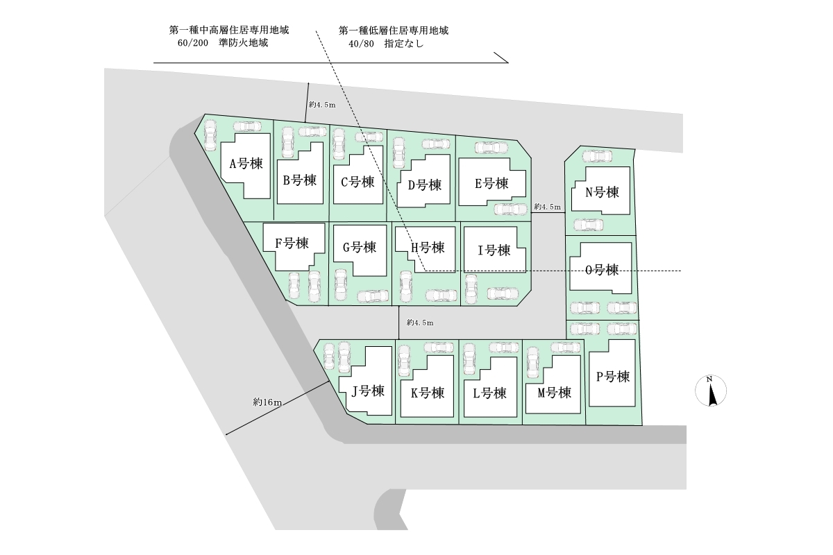| 用途地域 | 第一種低層住居専用地域/第一種中高層住居専用地域 | 建ぺい率 | 40%/60% |