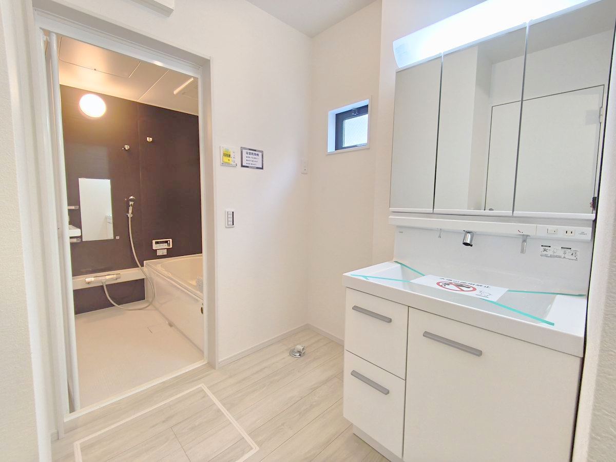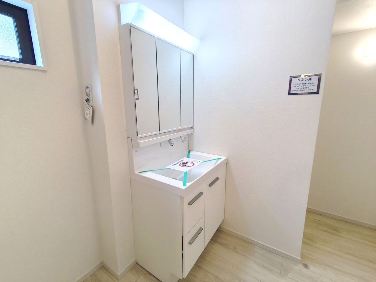 大きな三面鏡がついた洗面化粧台。鏡の裏にも収納があり洗面台がすっきりと片付きます。朝の身支度にも大変便利です。 ■八王子市富士見町 新築一戸建て■