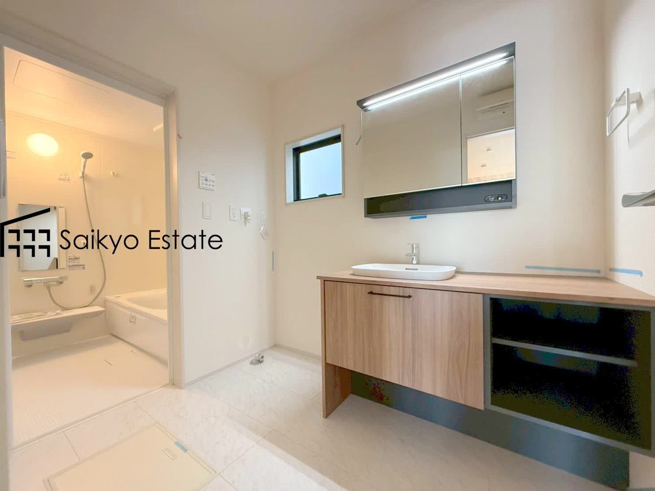 女性にはうれしいシャンプードレッサー付きの三面鏡洗面化粧台。収納スペースも十分ございますので、ドライヤーなどすっきりと片付きます♪