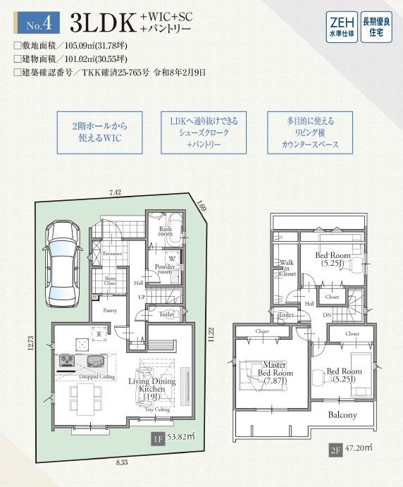 | 間取 | 3LDK+WIC+SC+パントリー (LDK19帖、洋室7.87帖、洋室5.25帖、洋室5.25帖) | ||