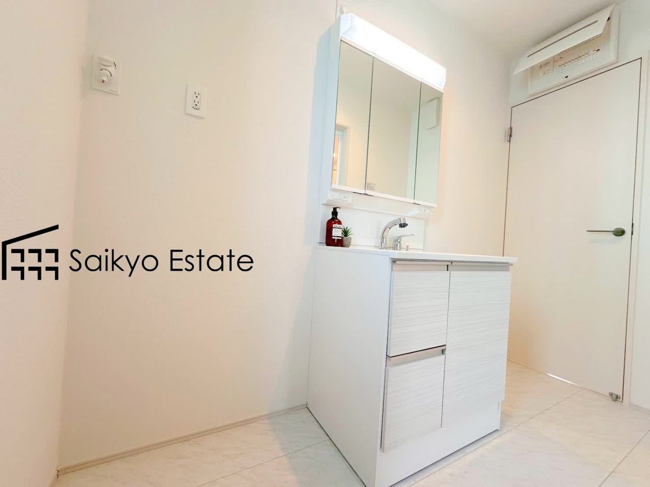 【施工例】女性にはうれしいシャンプードレッサー付きの三面鏡洗面化粧台。収納スペースも十分ございますので、ドライヤーなどすっきりと片付きます♪