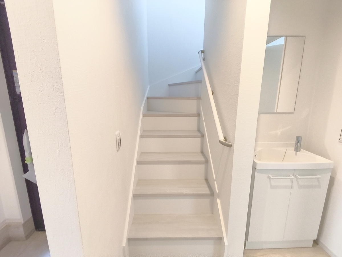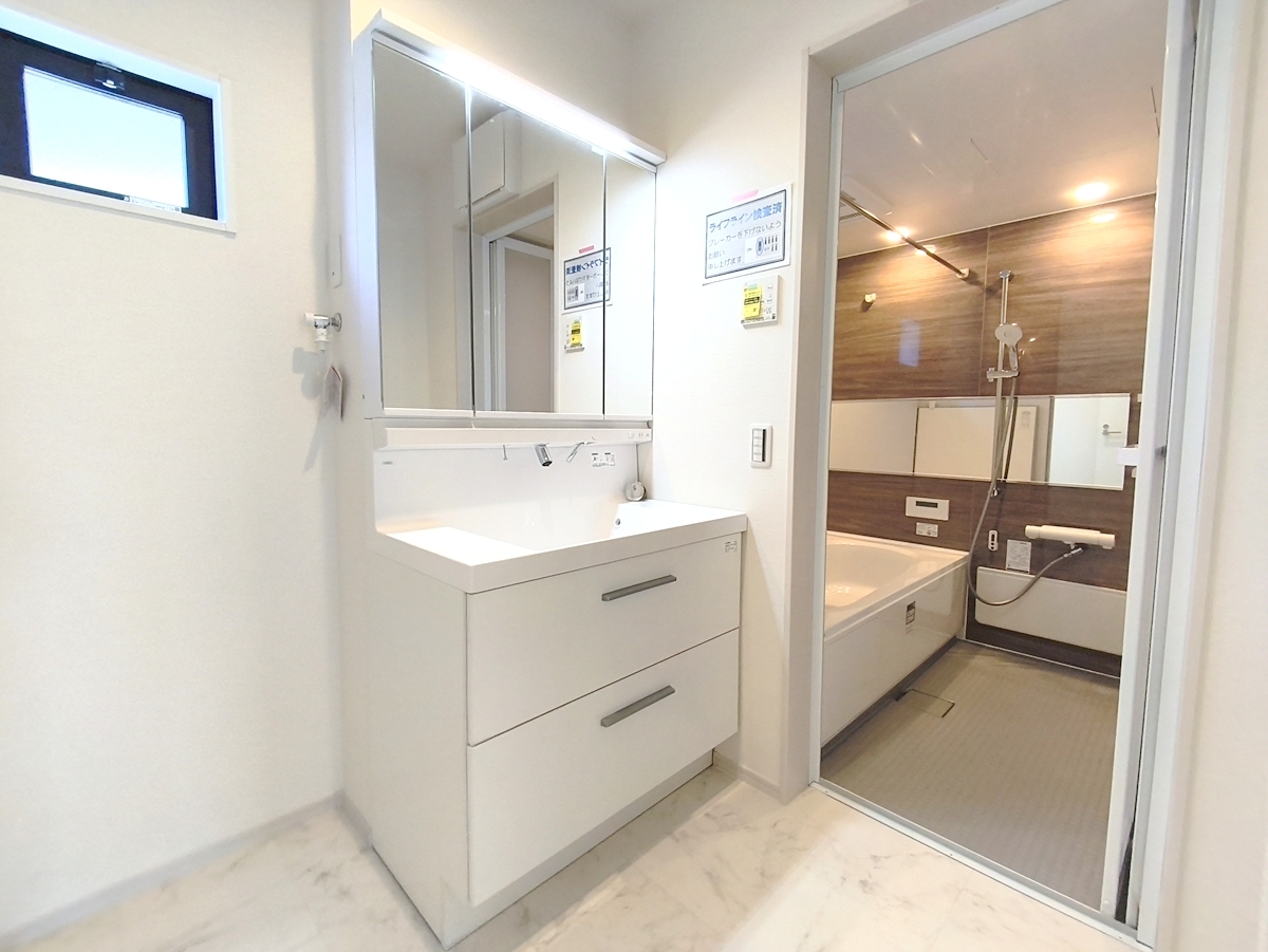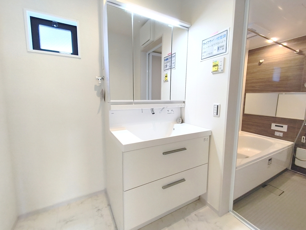 大きな三面鏡がついた洗面化粧台。鏡の裏にも収納があり洗面台がすっきりと片付きます。朝の身支度にも大変便利です。 ■小金井市緑町3 新築一戸建て■