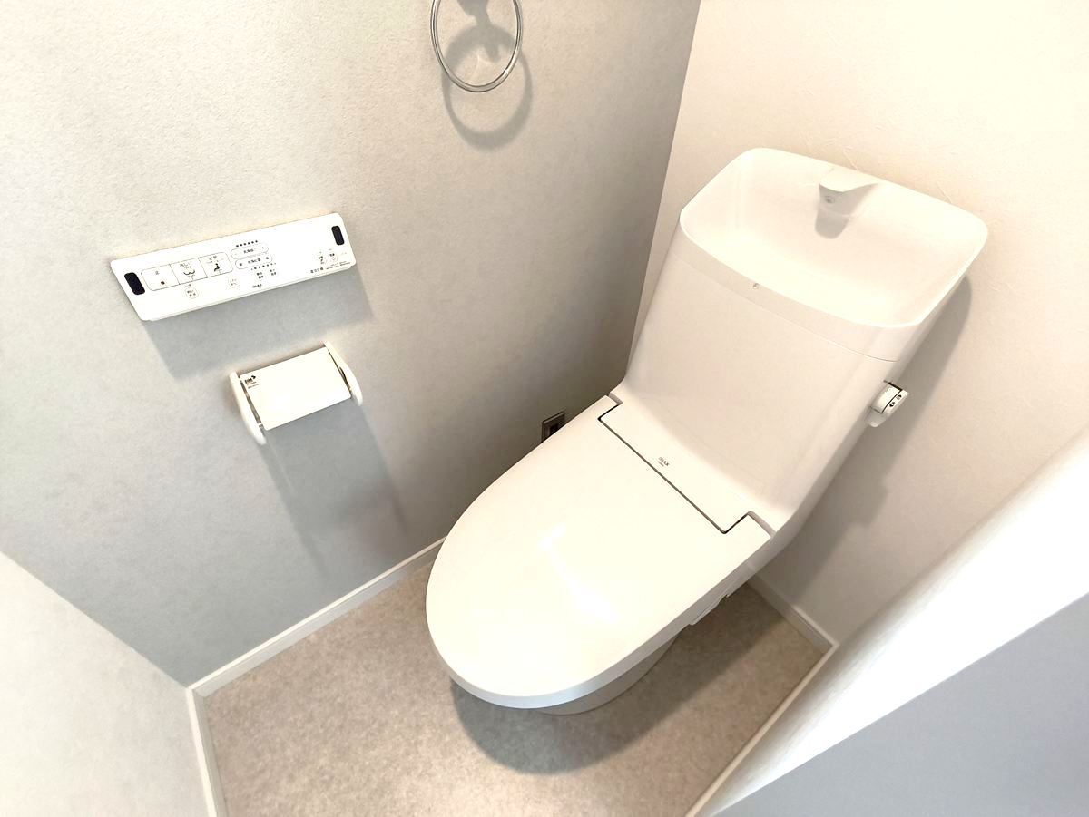 快適な温水洗浄便座。清潔感あふれる白いクロスに使いやすいハンドウォッシュ機能をプラス! ■国立市中2 新築一戸建て■