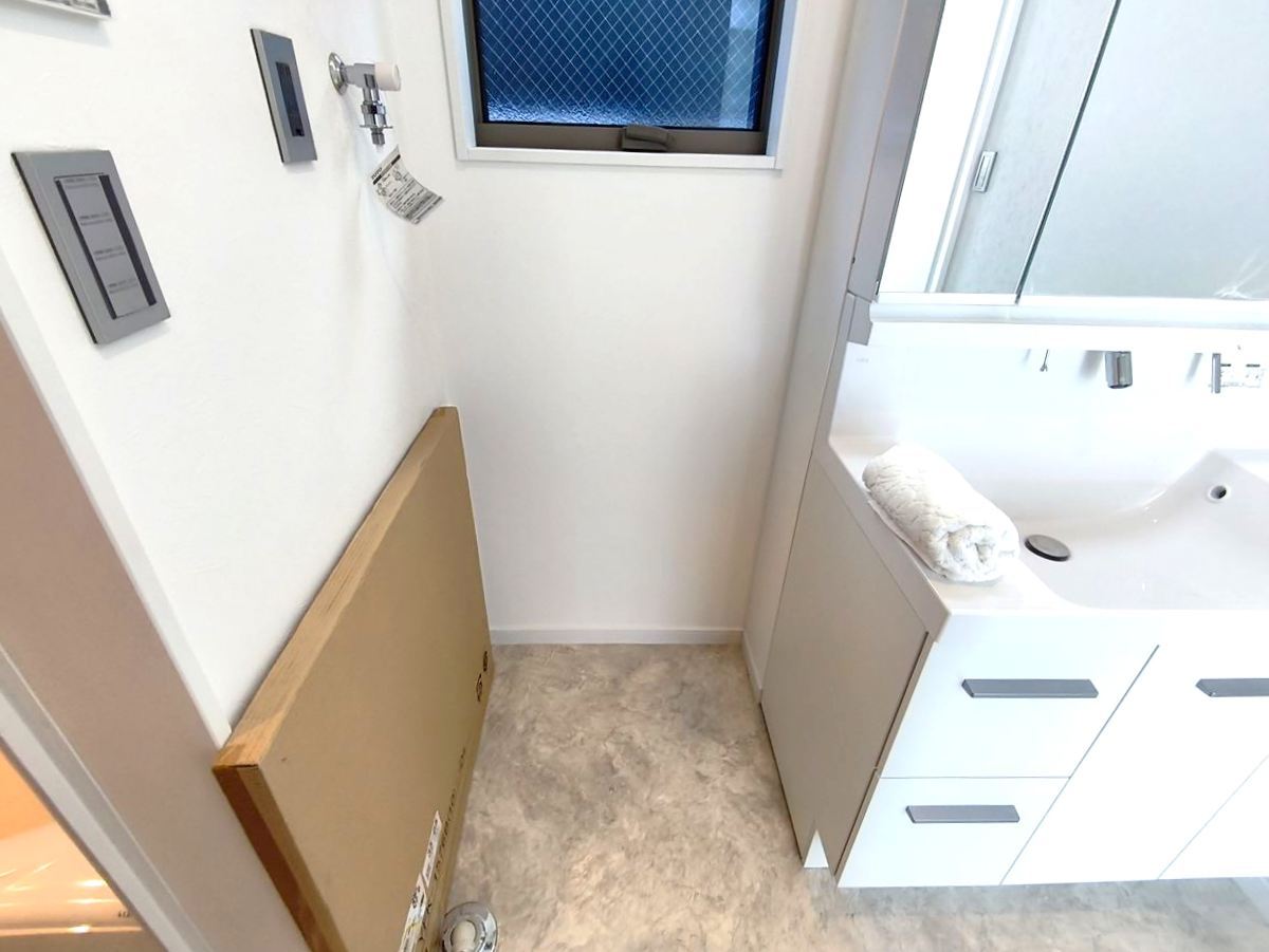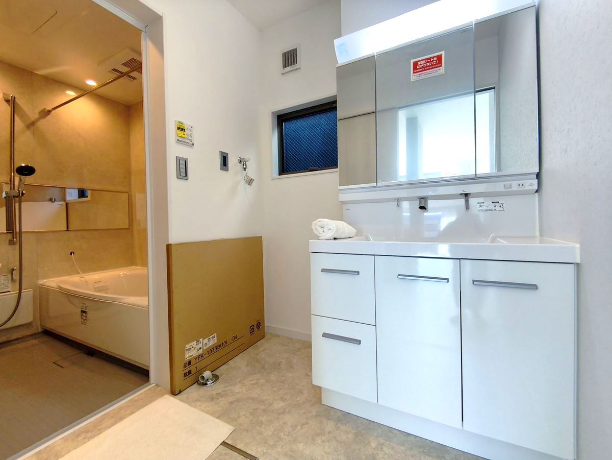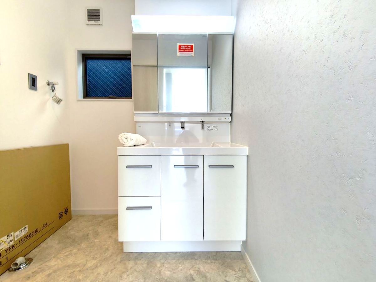 洗面台には三面鏡を採用。身だしなみを整えやすい事はもちろんですが、鏡の後ろに収納スペースを設ける事により、散らかりやすい洗面スペースをすっきりさせる事が出来るのも嬉しいですね。 ■国立市中2 新築一戸建て■