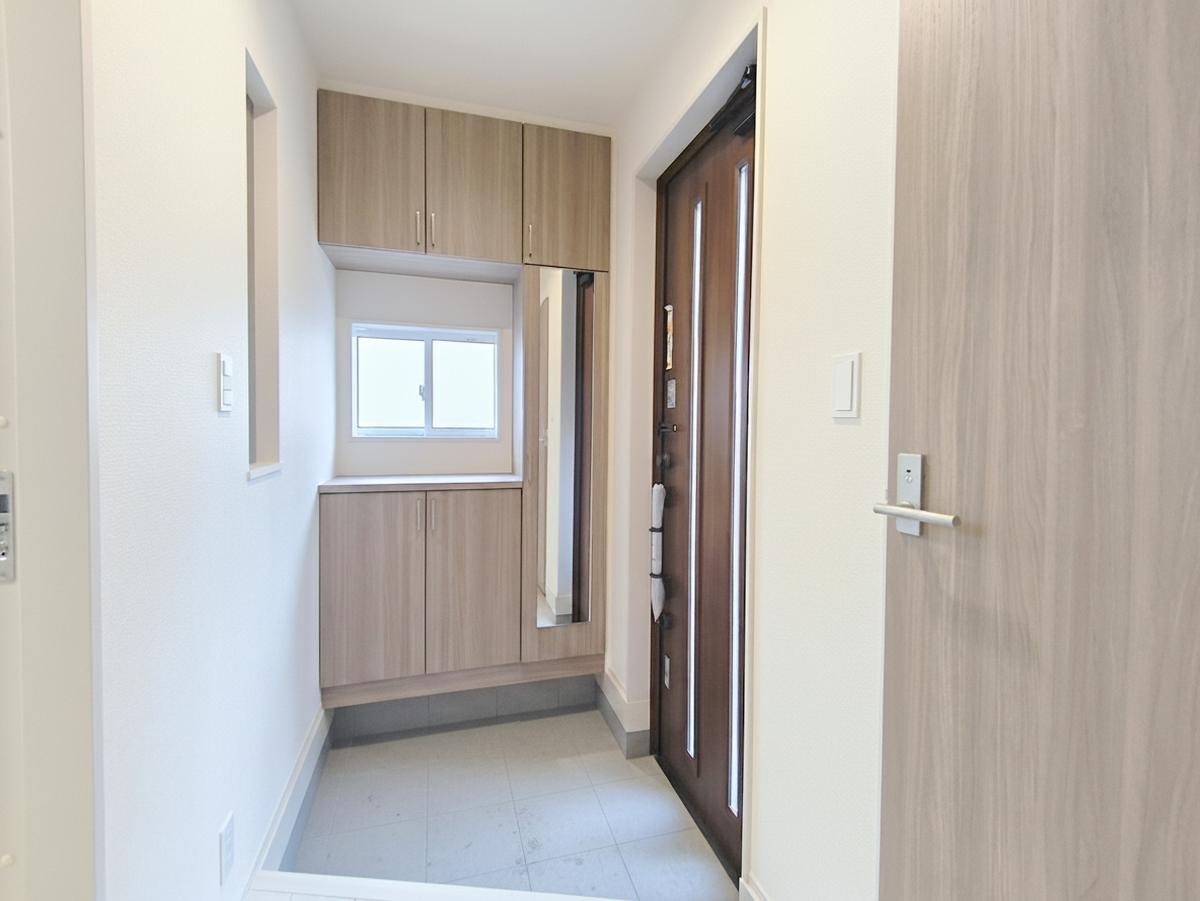 お出かけ前の身だしなみチェックが出来る姿見鏡付の玄関収納。かさばる物も収納できる優れものです。 ■昭島市緑町3 新築一戸建て■