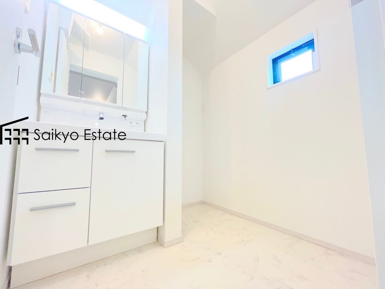 【施工例】女性にはうれしいシャンプードレッサー付きの三面鏡洗面化粧台。収納スペースも十分ございますので、ドライヤーなどすっきりと片付きます♪
