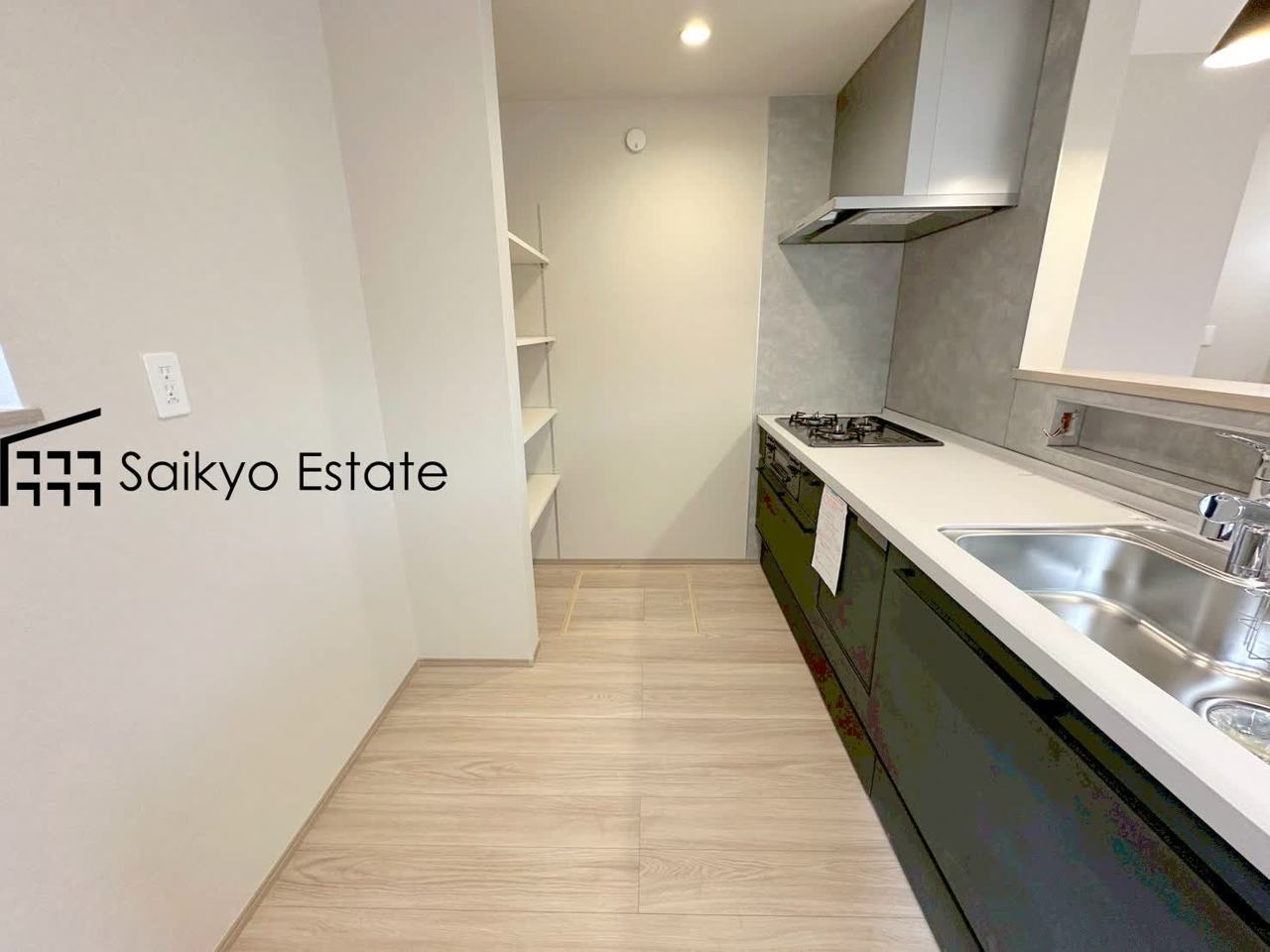 キッチンには可動棚付きの収納がございます。備蓄倉庫としてはもちろん、調理道具の収納なども出来て便利です。