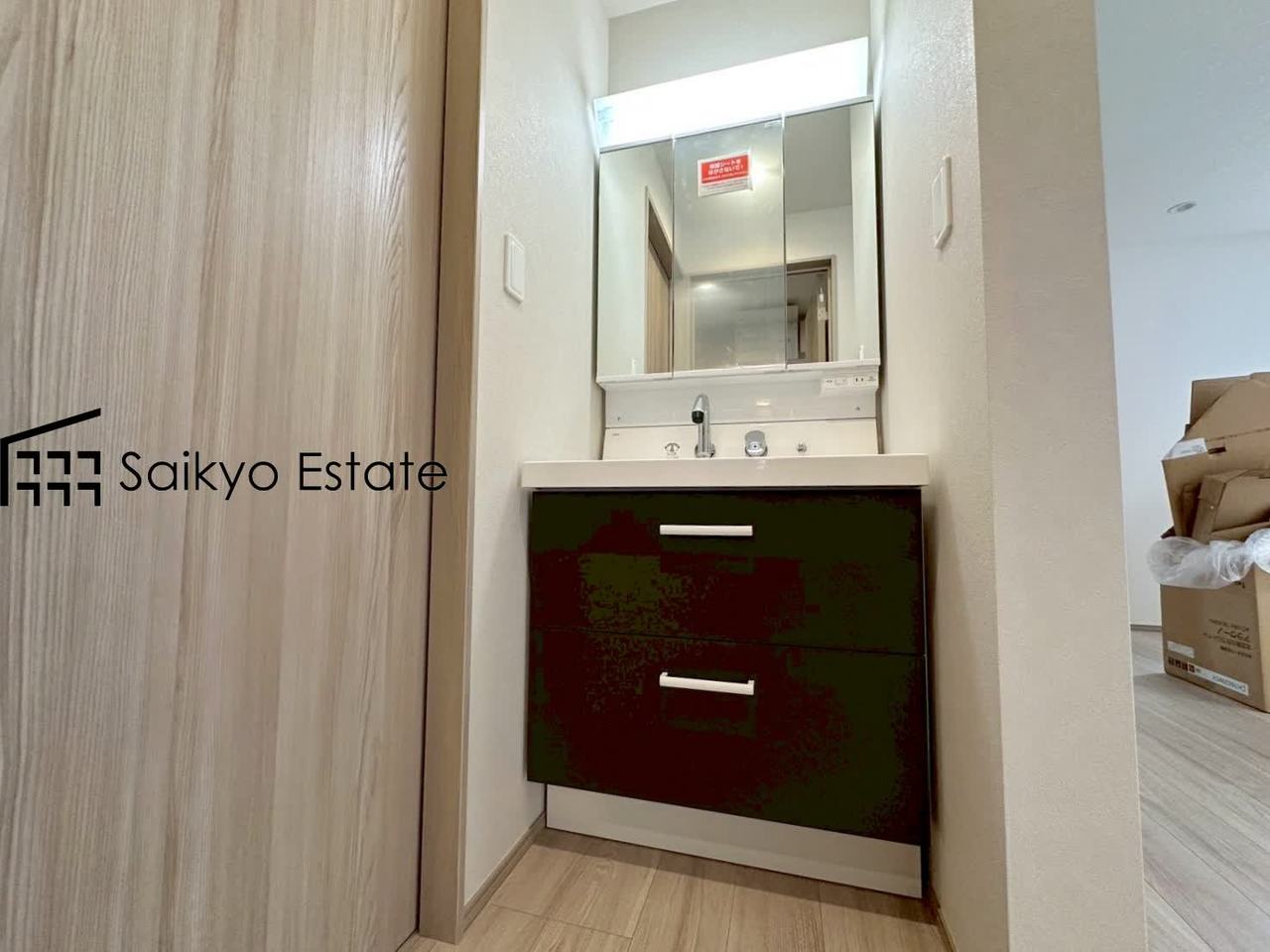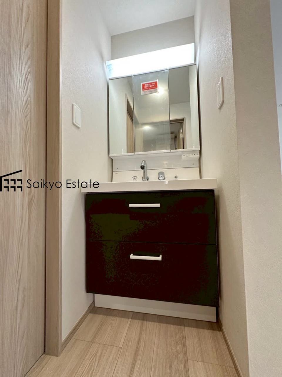 三面鏡付きの洗面化粧台を完備。収納スペースも十分ございますので、ドライヤーなどすっきりと片付きます♪(2号棟)
