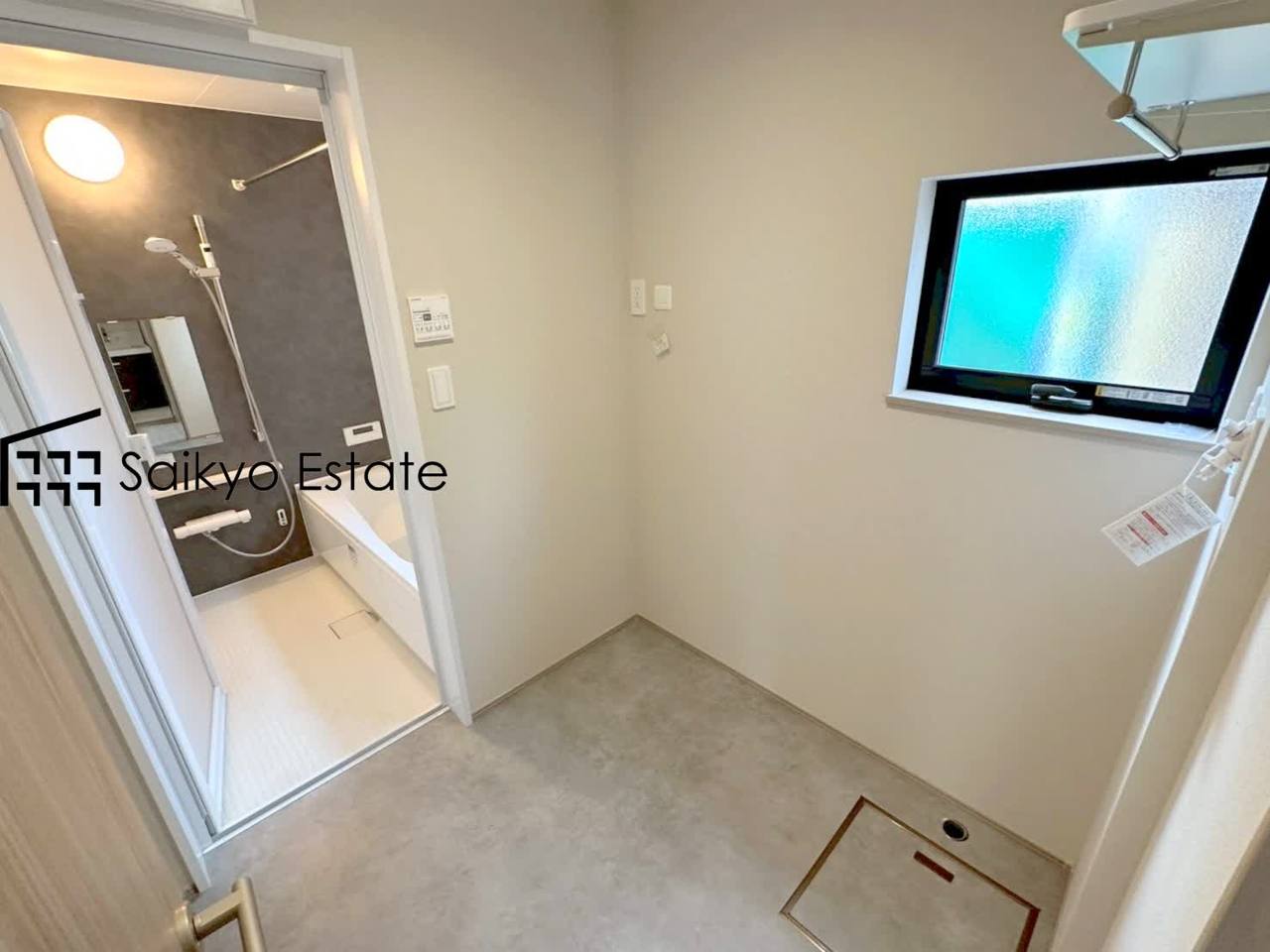 洗面脱衣室は広々とした空間です。棚や収納を置いてリネン庫としてもお使いいただけます。