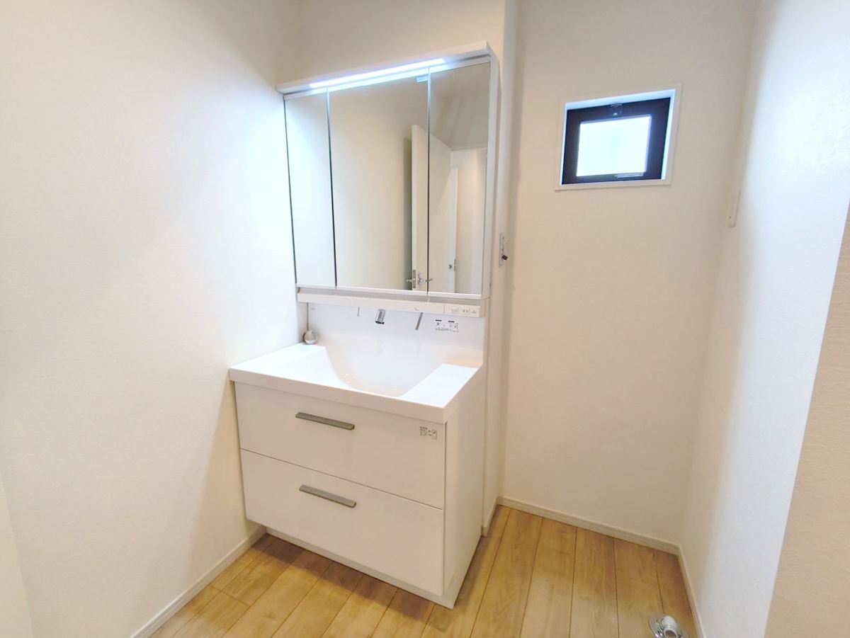 大きな三面鏡がついた洗面化粧台。鏡の裏にも収納があり洗面台がすっきりと片付きます。朝の身支度にも大変便利です。■日野市万願寺6 新築一戸建て■