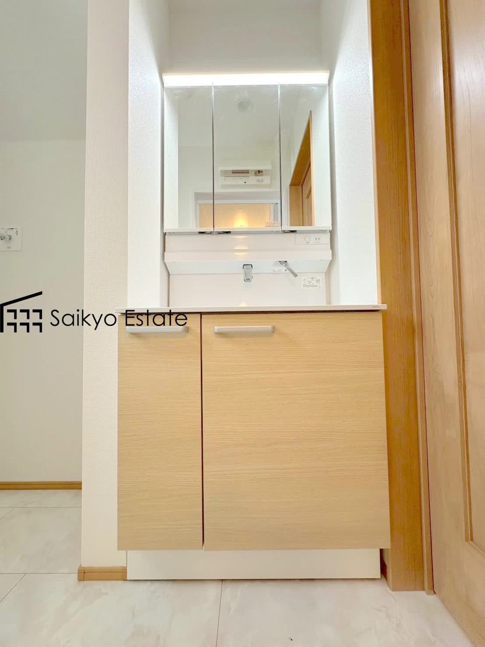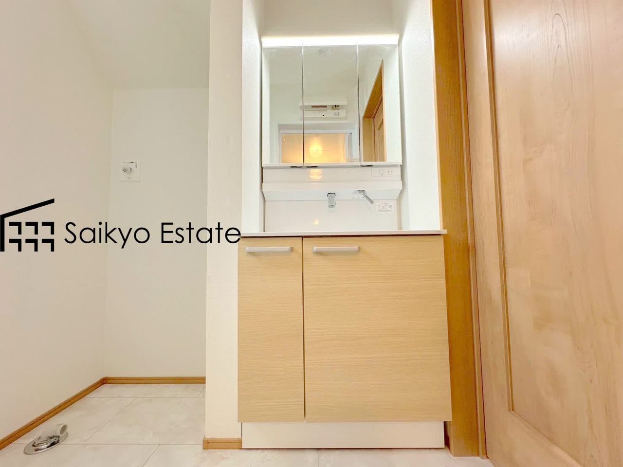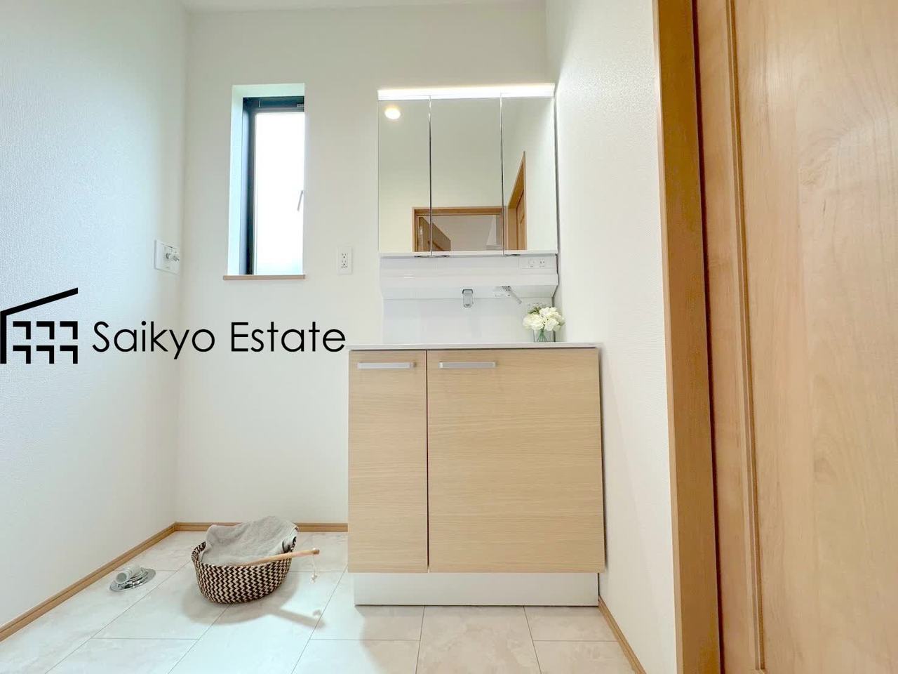 女性にはうれしいシャンプードレッサー付きの三面鏡洗面化粧台。収納スペースも十分ございますので、ドライヤーなどすっきりと片付きます♪