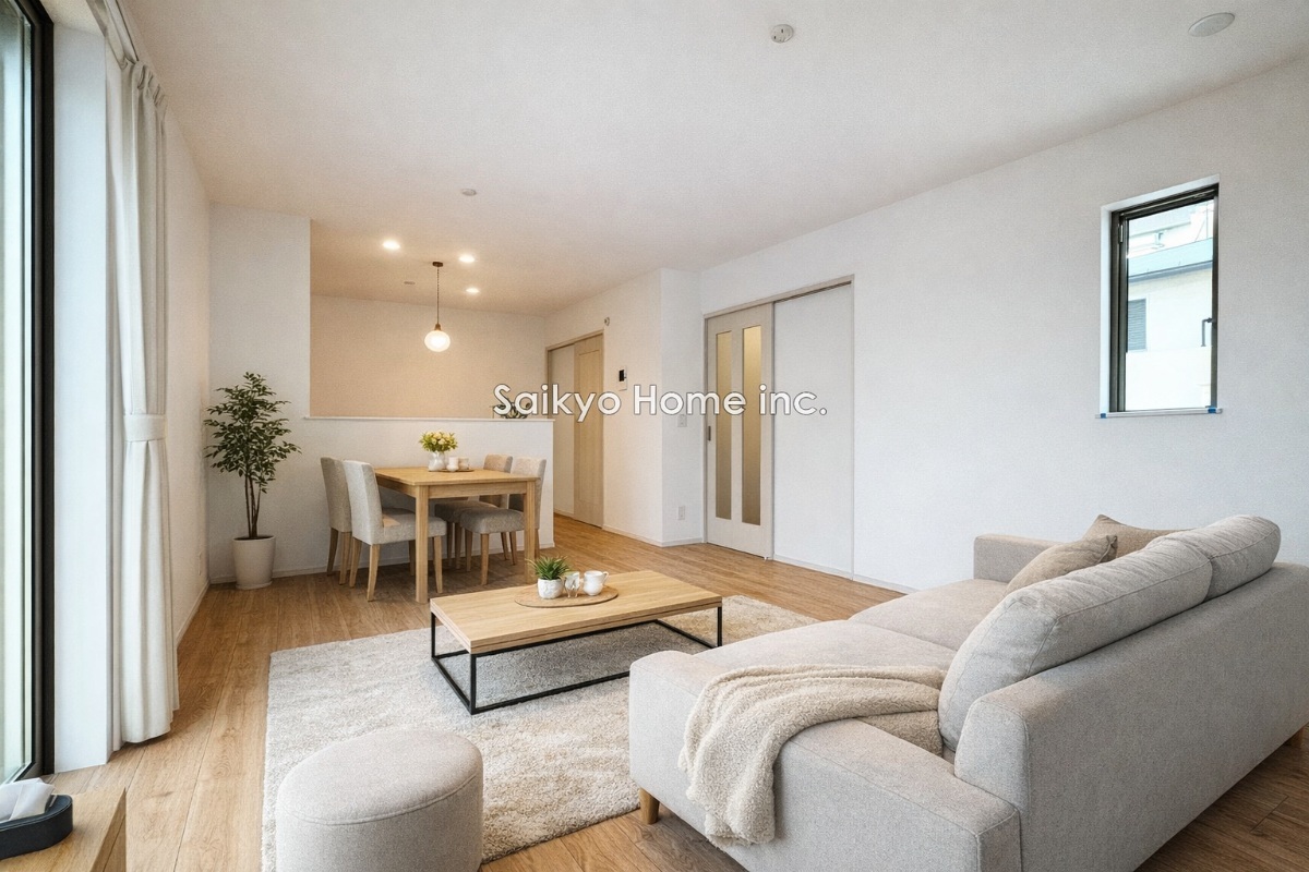 陽光ふりそそぐ明るいリビング。対面式キッチンは、家事をしながら家族の様子が一目でわかる安心&便利設備!※家具等はCG加工しております。■小金井市貫井南町1 新築一戸建て■