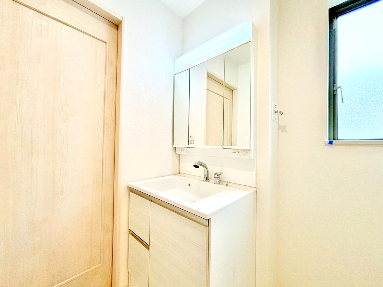 三面鏡が付いた洗面台はお掃除やメンテナンスが楽です。ドラム式の洗濯機を配置しても十分なスペースを確保した設計となっております。■小金井市貫井南町1 新築一戸建て■