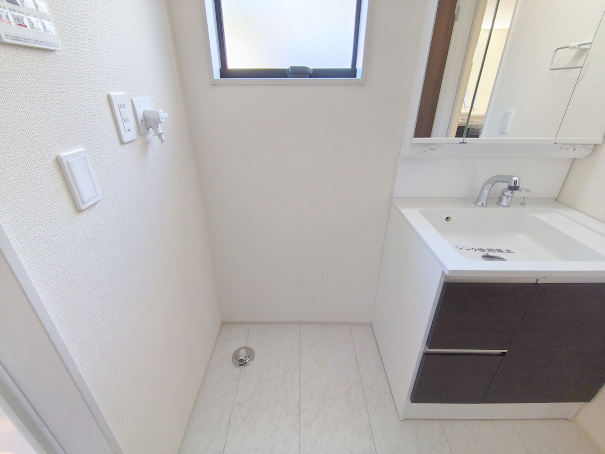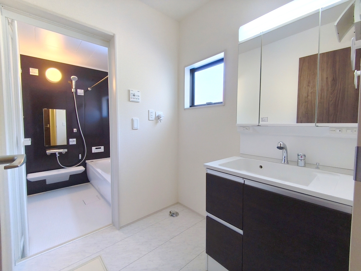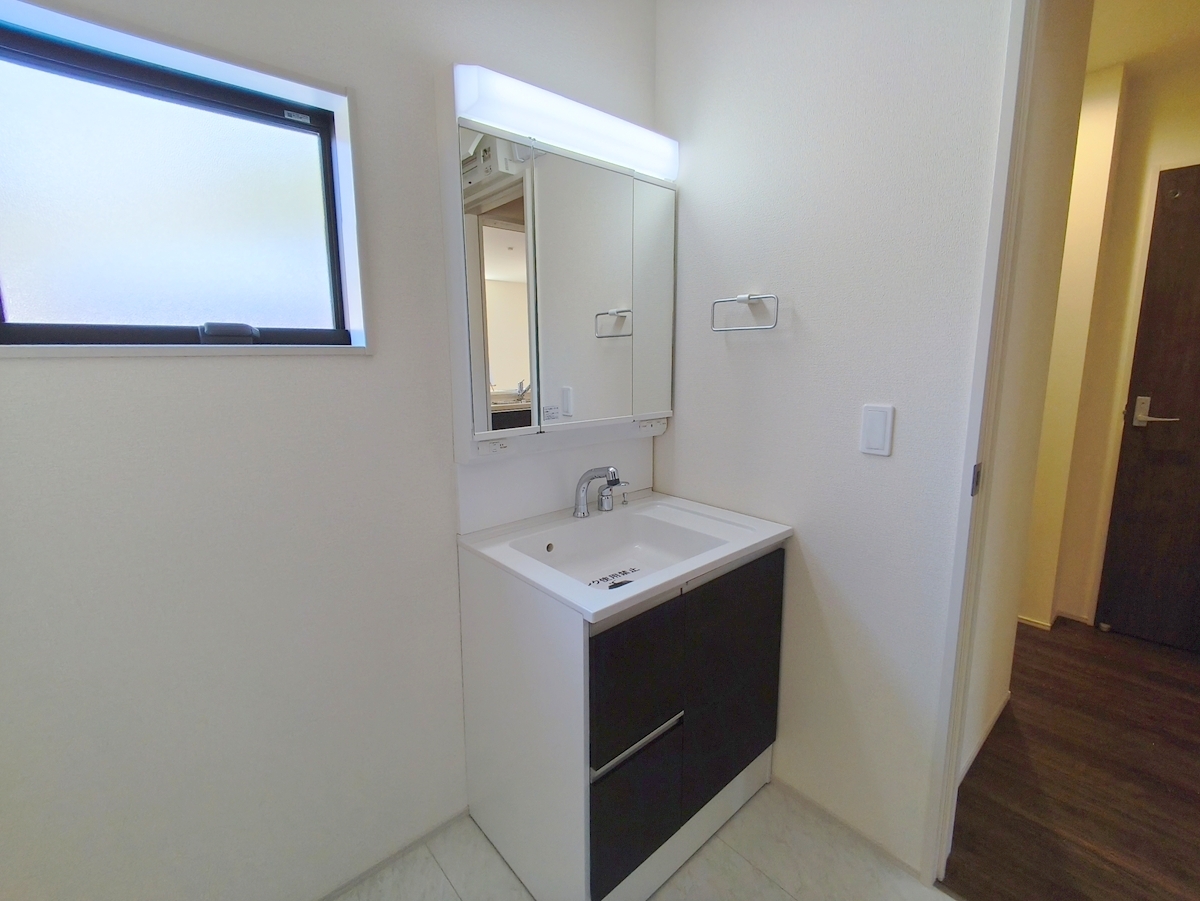 大きな三面鏡がついた洗面化粧台。鏡の裏にも収納があり洗面台がすっきりと片付きます。朝の身支度にも大変便利です。■昭島市東町5 新築一戸建て■