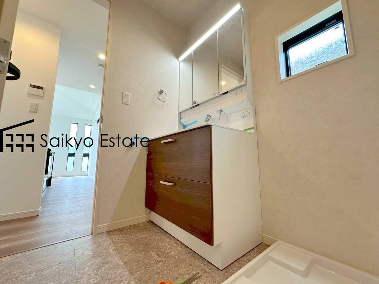 女性にはうれしいシャンプードレッサー付きの三面鏡洗面化粧台。収納スペースも十分ございますので、ドライヤーなどすっきりと片付きます♪
