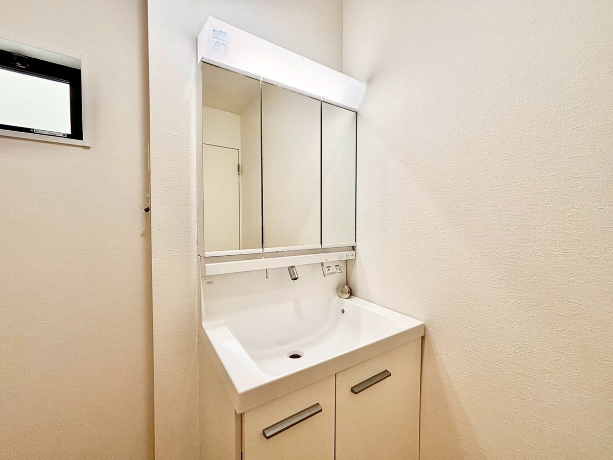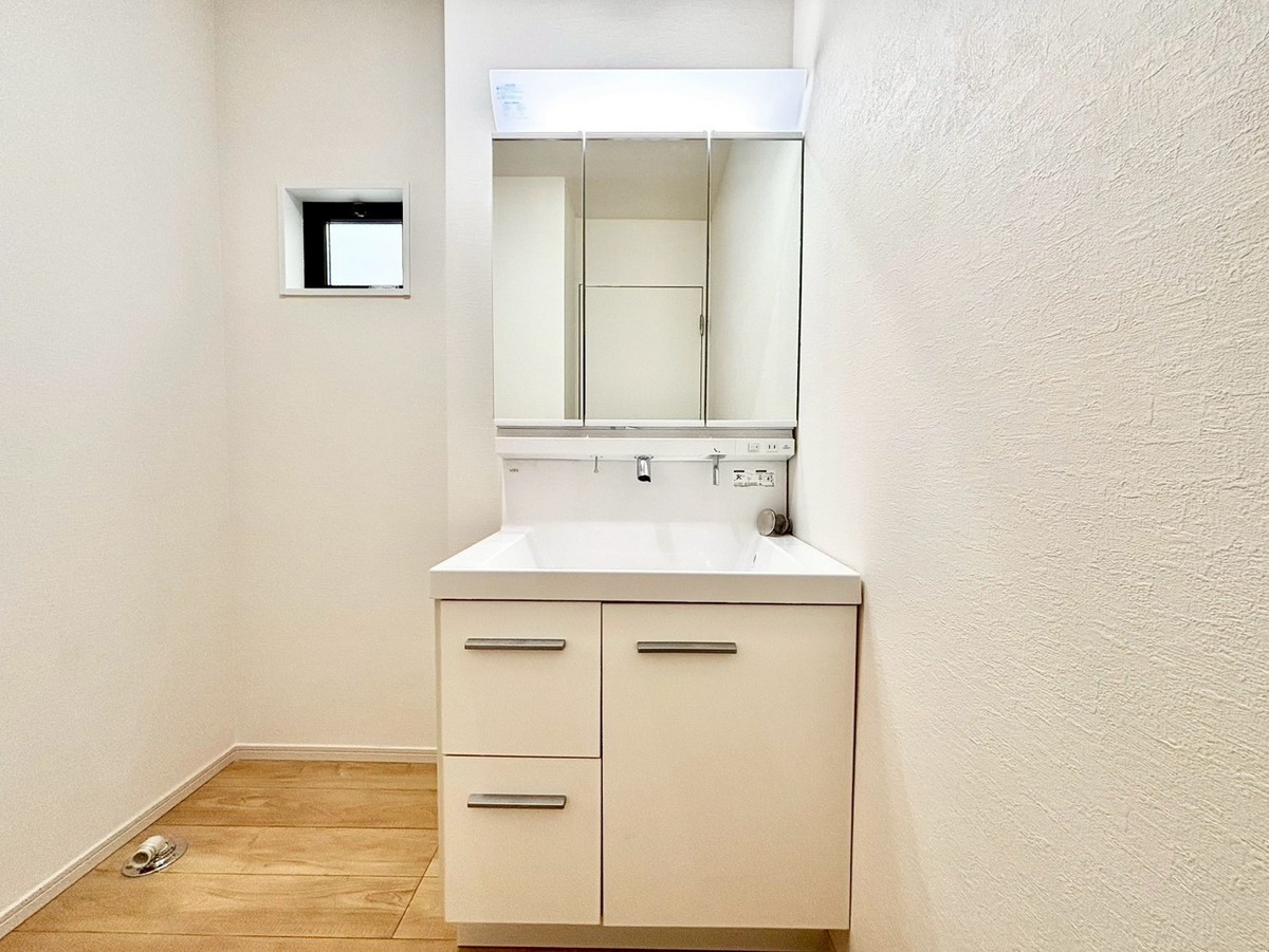 大きな三面鏡がついた洗面化粧台。鏡の裏にも収納があり洗面台がすっきりと片付きます。朝の身支度にも大変便利です。 ■府中市浅間町4丁目 新築戸建て■