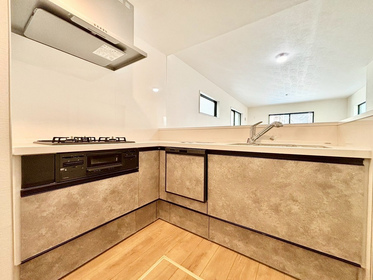 キッチン内での作業動線が短く、作業スペースが広くなるL字キッチン。小さなお子様がいるご家庭でも料理をしながらリビングの様子が伺える安心設計! ■府中市浅間町4丁目 新築戸建て■
