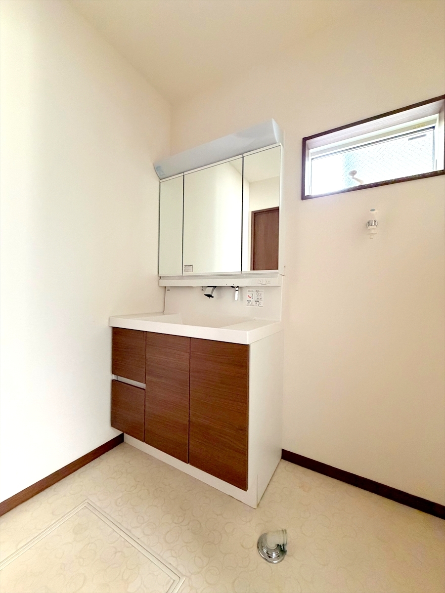 大きな三面鏡がついた洗面化粧台。鏡の裏にも収納があり洗面台がすっきりと片付きます。朝の身支度にも大変便利です。■日野市石田1 中古戸建■