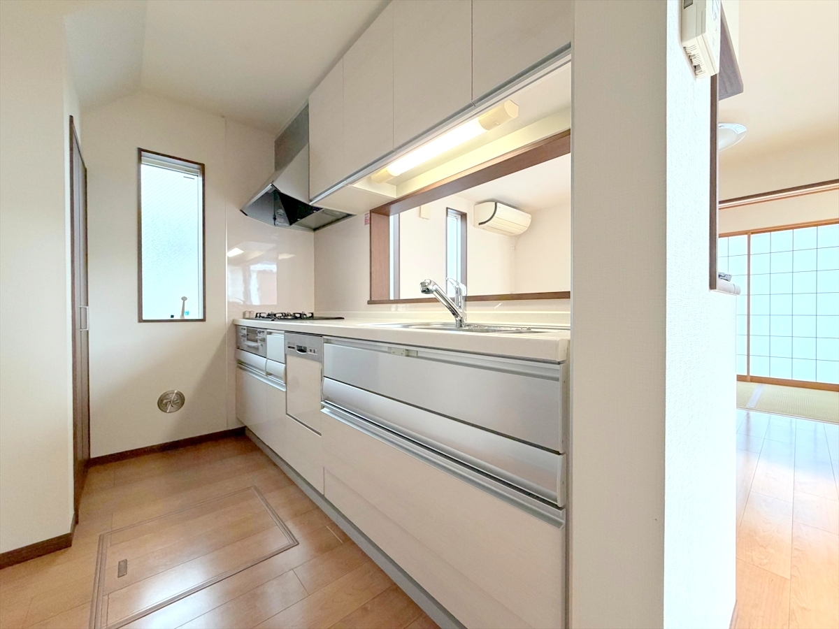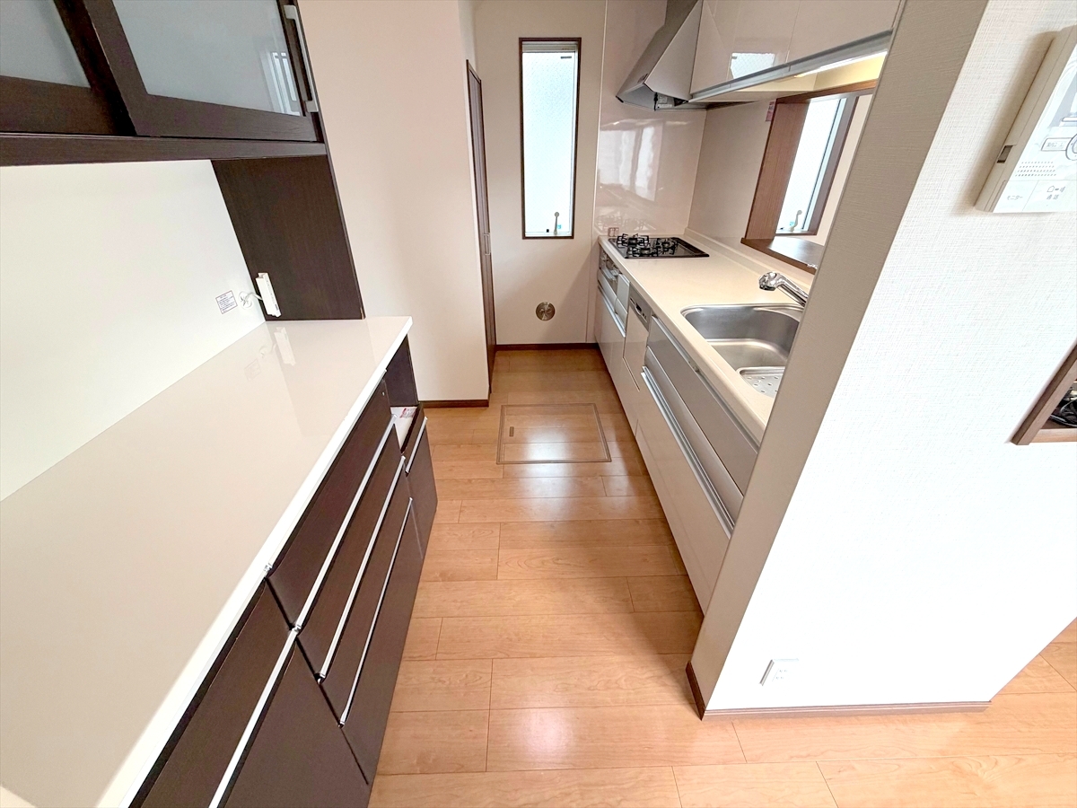 オープンカフェスタイルが特徴的なキッチン。開放感はもちろん、お子様から目を離さずにお料理出来るため奥様方に大好評。■日野市石田1 中古戸建■