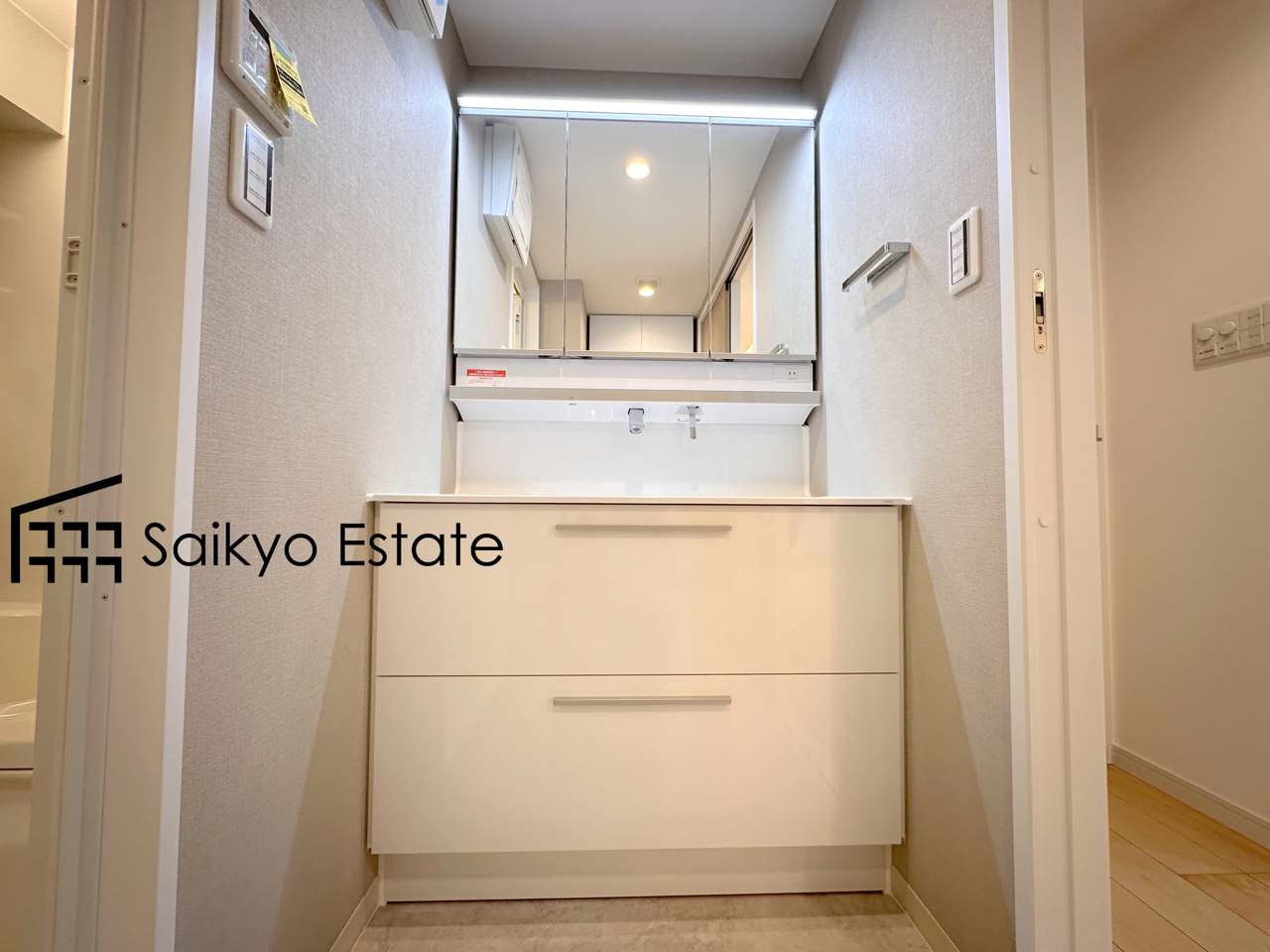 三面鏡付きの洗面化粧台を完備。収納スペースも十分ございますので、ドライヤーなどすっきりと片付きます♪