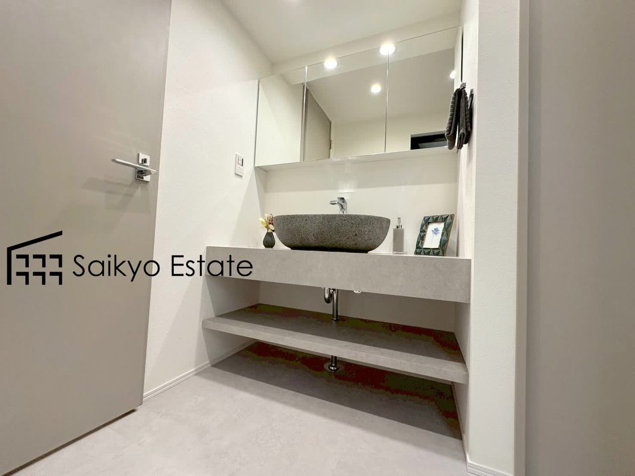 三面鏡付きの洗面化粧台を完備。収納スペースも十分ございますので、ドライヤーなどすっきりと片付きます♪