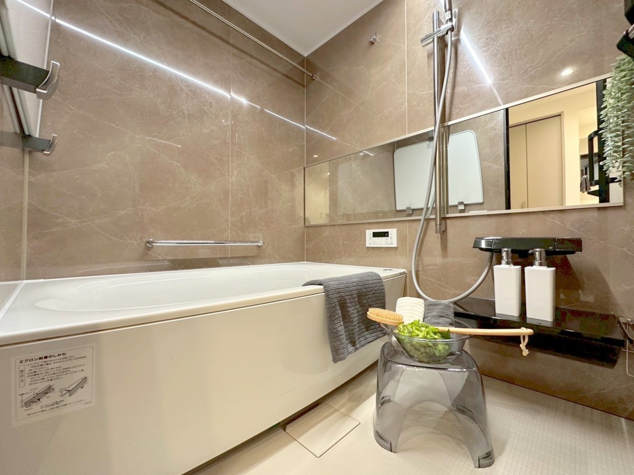 一日の疲れを癒してくれる落ち着いた色合いのバスルーム♪雨の日のお洗濯も安心な浴室乾燥機付きです。