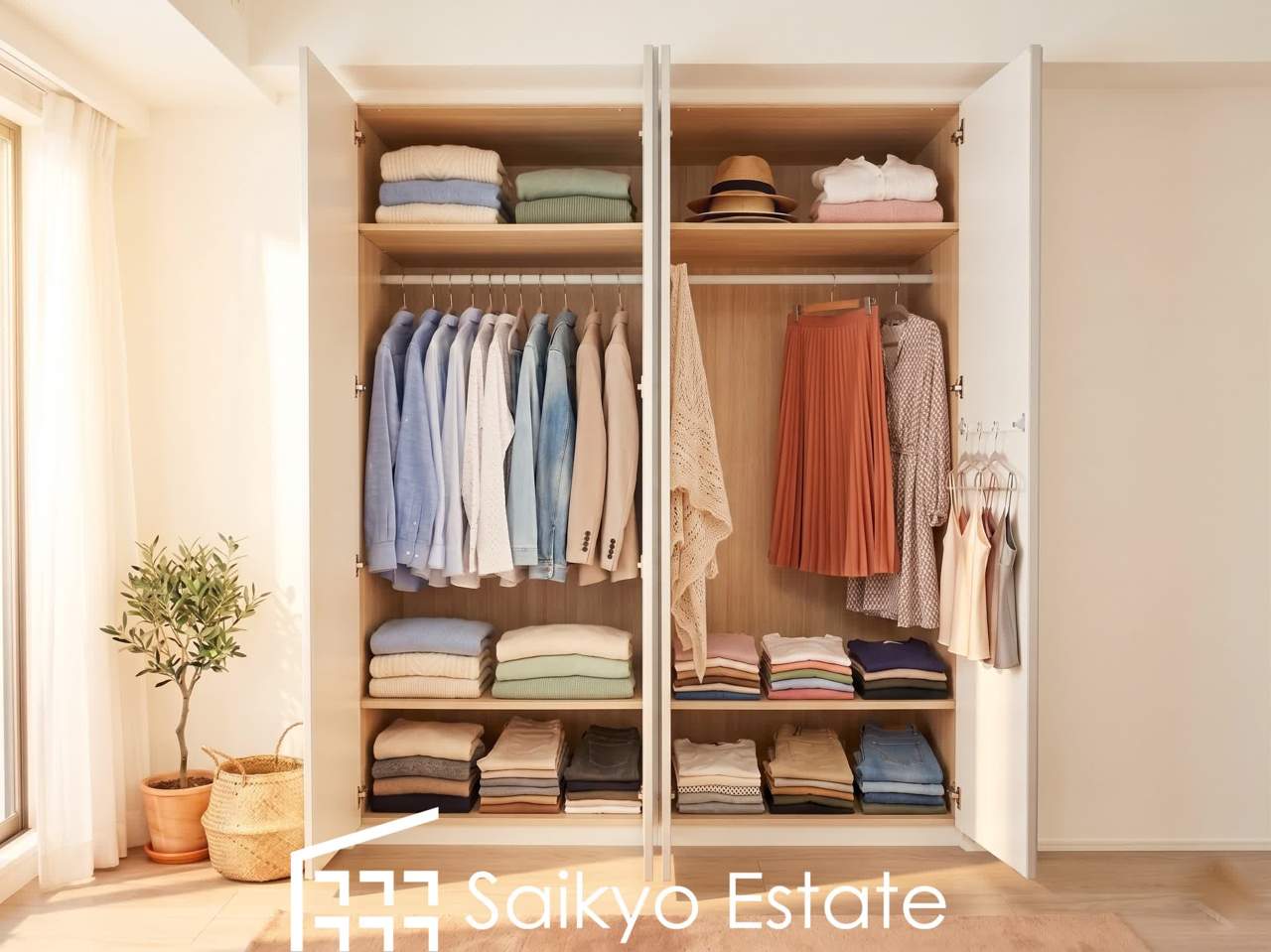 ダブルクローゼットのある洋室は、ご夫婦でクローゼットを使い分けができますので主寝室に最適です。 ※衣類等はCG加工しています。