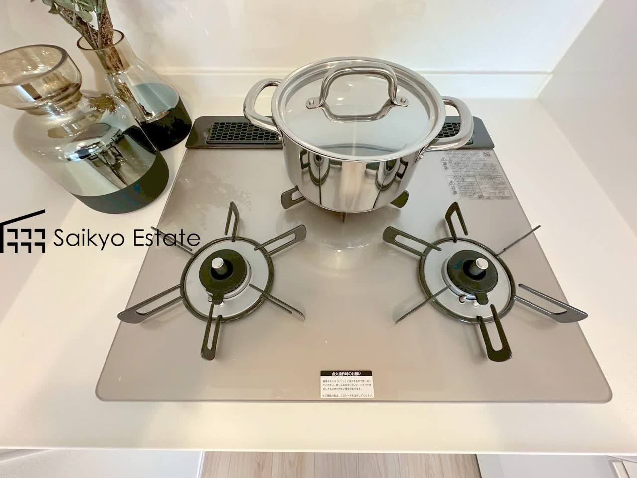 3口ガスコンロシステムはたくさんの料理が同時に作れて便利な上、凹凸が少ないフラットトップなのでお掃除も楽々です。