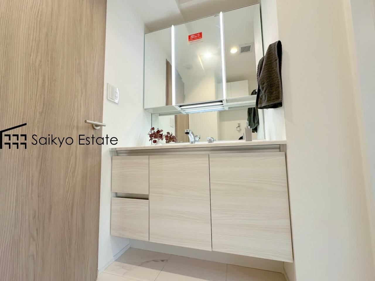 三面鏡付きの洗面化粧台を完備。収納スペースも十分ございますので、ドライヤーなどすっきりと片付きます♪