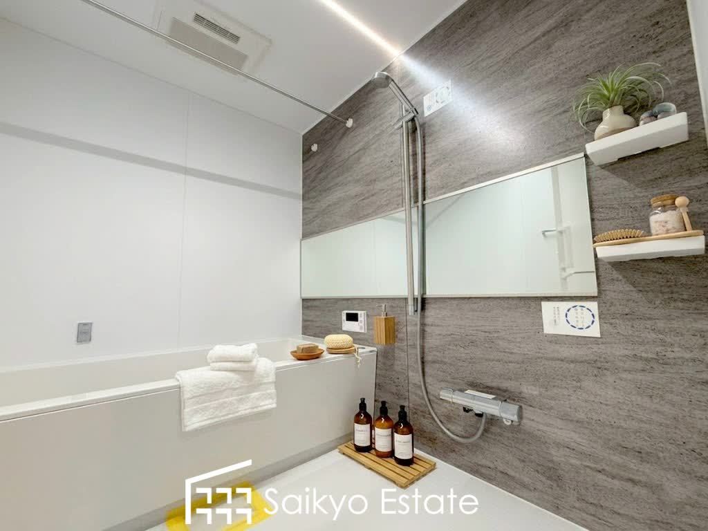 一日の疲れを癒してくれる落ち着いた色合いのバスルーム♪雨の日のお洗濯も安心な浴室乾燥機付きです。※小物類はCG加工しています。
