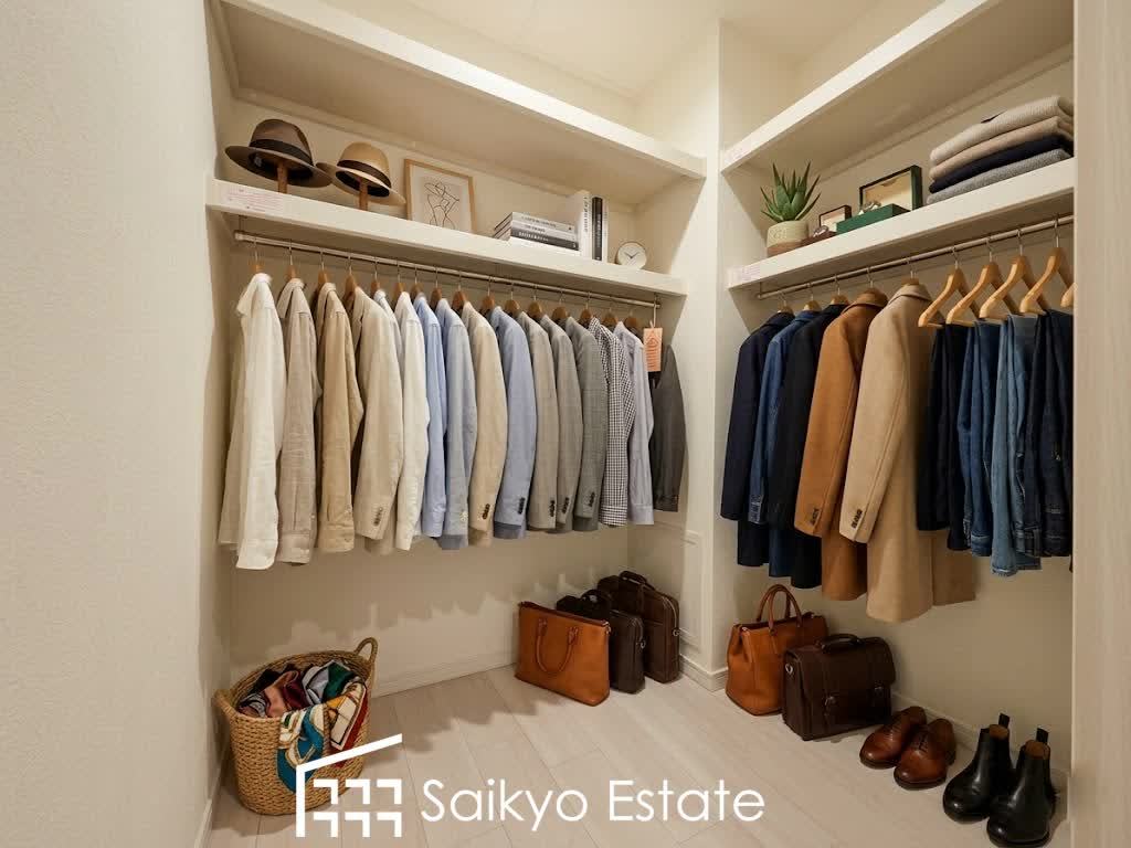 ひと目で収納物を確認できるウォークインクロゼットは、ゆとりの広さを備えた大型収納。数多くの衣類に加え、足元には引出しや衣装箱、シューズボックスなども収納することができます。※衣類や小物類はCG加工しています。