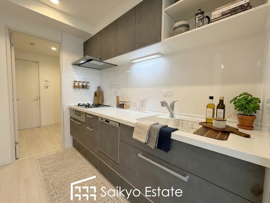 直線的な動線で作業がしやすい壁付けキッチン!キッチンスペースにはカウンターがございますので、食事の配膳や後片付けも楽々です♪※小物類はCG加工しています。