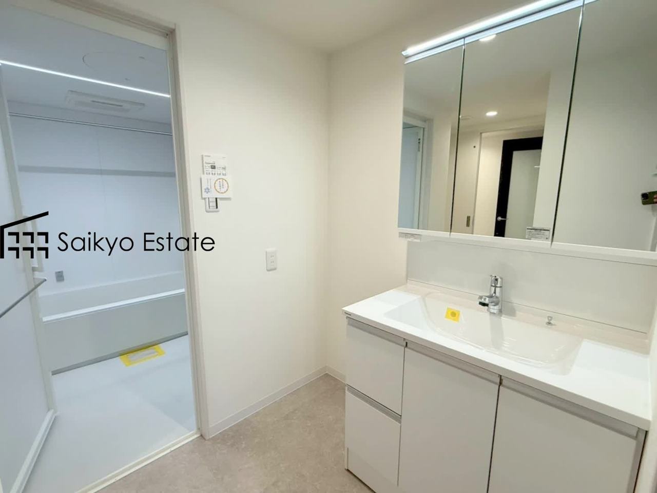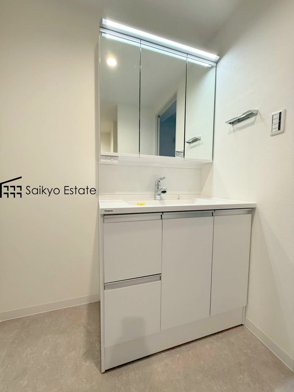 三面鏡付きの洗面化粧台を完備。収納スペースも十分ございますので、ドライヤーなどすっきりと片付きます♪