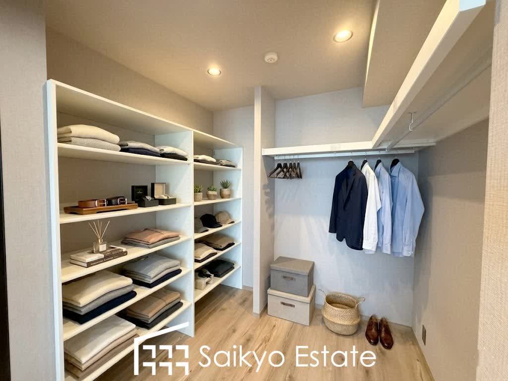 ひと目で収納物を確認できるウォークインクローゼットは、ゆとりの広さを備えた大型収納。衣装ケースなどを置く事で更に収納力をアップできます!※衣類や小物類はCG加工しています。