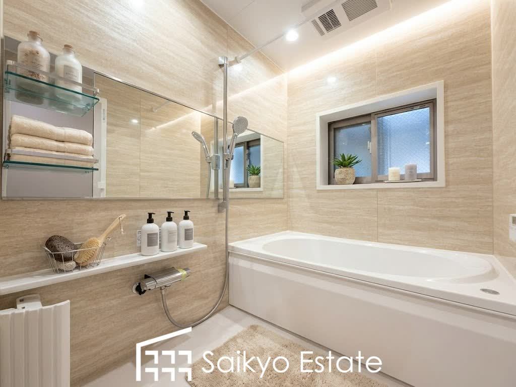 一日の疲れを癒してくれる落ち着いた色合いのバスルーム♪雨の日のお洗濯も安心な浴室乾燥機付きです。※小物類はCG加工しています。