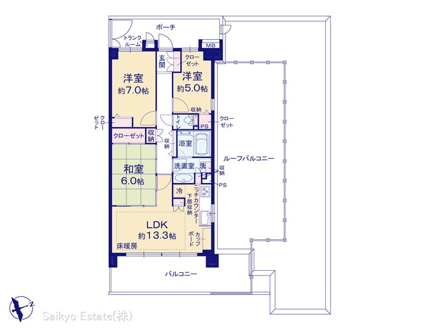 | 備考・制限等 | インターネット利用料:1290円、フレンドリークラブ会費:400円 長期修繕計画書有 ペット飼育:可(細則有)、ペットコミュニティークラブ入会金10,000円、ペットコミュニティークラブ会費月額1800円(2頭飼育の場合は650円加算) ウェルカムポーチ面積:12.45平米有 構造:一部鉄筋コンクリート造 専有面積にトランクルーム面積0.3平米含む 事務所利用:不可 ルーフバルコニー面積:58.92平米 ルーフバルコニー使用料:1770円/月 |